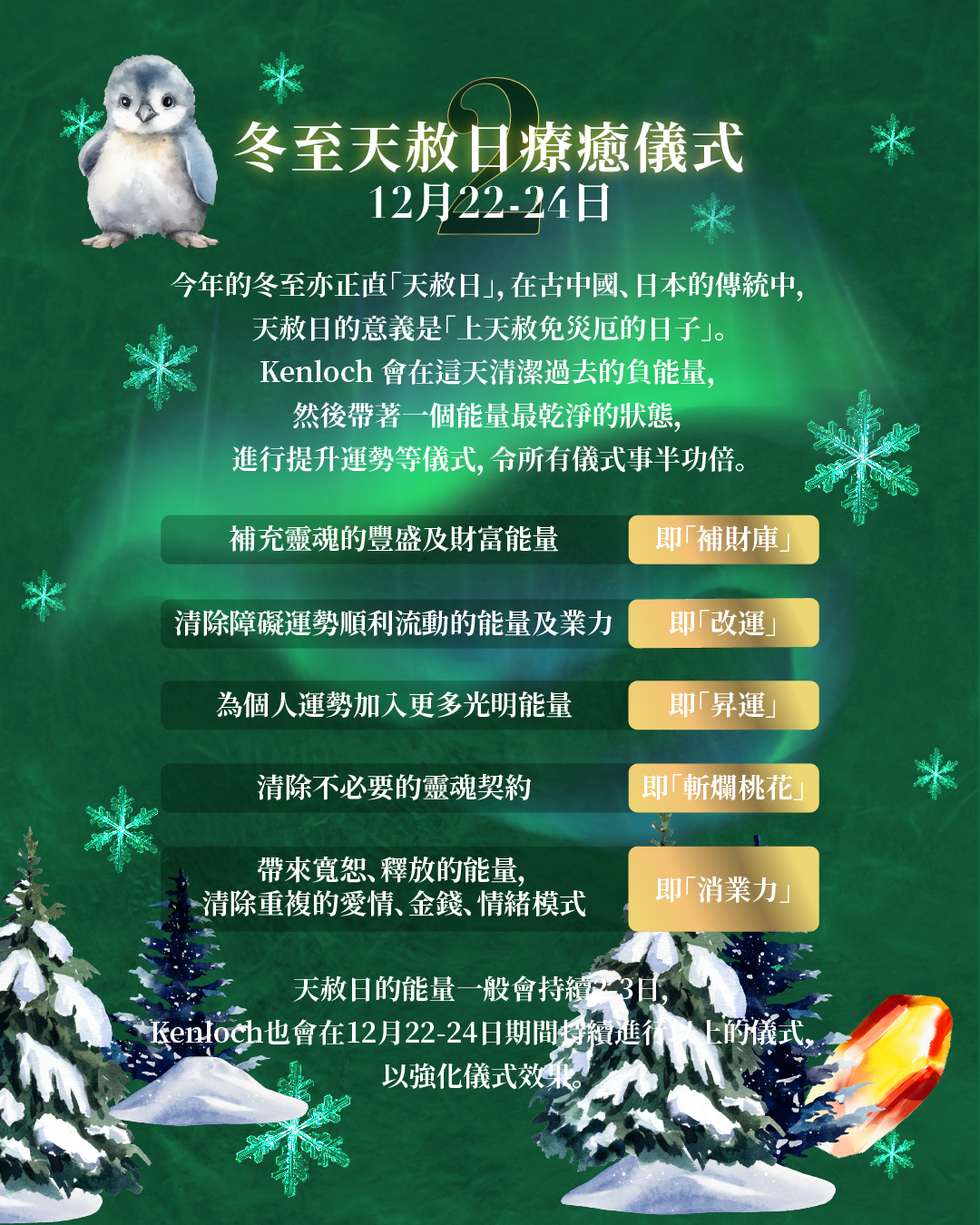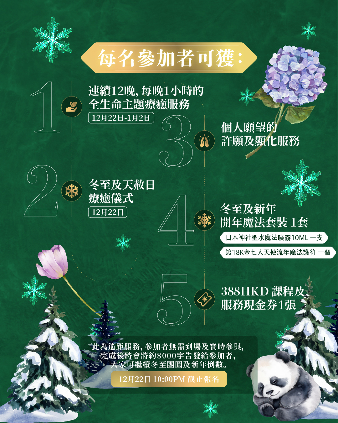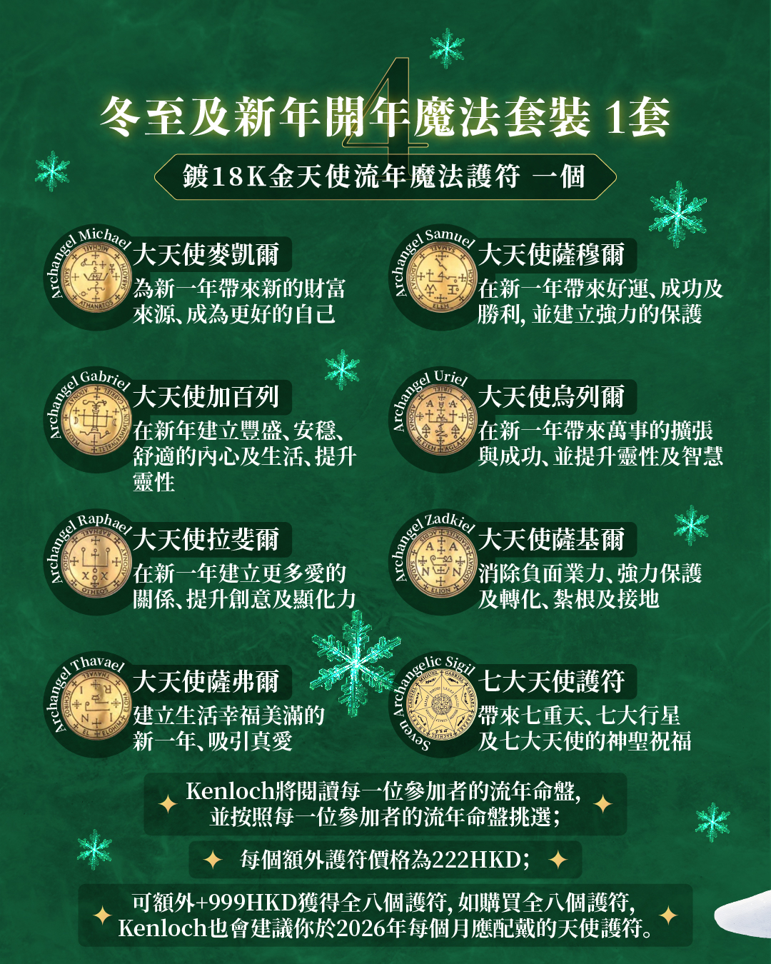 ⛩️☀️冬至及2026新年集體療癒儀式☀️⛩️ 「啟動新一年的無限潛能。」 “Unleashed the infinite potential of new year.” 日期及時間: 2025年12月22日至2026年1月2日 每晚11:00PM-12:00PM 截止報名時間為:2025年12月22日 10:00PM *此為遙距服務,參加者無需到場及實時參與, 完成後將會將約8000字告發給參加者, 大家可繼續冬至團圓及新年倒數🌟 每名參加者可獲✨: 1. ⛩️連續12晚,每晚1小時的全生命主題療癒服務(22/12-2/1) 2. ⛩️冬至及天赦日療癒儀式 3. ⛩️個人願望許願及顯化儀式 4. ⛩️冬至及新年日本聖地能量魔法套裝 1套,每套包括: 日本神社聖水魔法噴霧10ML 一支 —— 龍神祝福 或|萬佛甘露|天地之愛 鍍18K金七大天使流年魔法護符 一個 5. ⛩️388HKD課程及服務現金券 1張 ☀️關於冬至及新年日本聖地集體療癒 ☀️ 冬至(22/12)是全年度日照最短的時候,太陽的力量在此時變得更溫和沈穩,人類可藉此更親近太陽,吸收太陽的能量。因此巫師們會在冬至舉辦儀式,與太陽神的力量連結,並且與眾神攜手,將光明與祝福傳送到所有人身上。 冬至集體儀式將為每一參加者連續十二晚進行橫跨生命十二主題的療癒🐉為大家創造美好的正面改變🌟並清理過去的陳舊能量,為大家「破舊立新」,使大家帶著一個全新而充滿力量的自我,走進2025年。 今年的冬至亦正直「天赦日」,在古中國、日本的傳統中,天赦日的意義是「上天赦免災厄的日子」。Kenloch 會在這天清潔過去的負能量,然後帶著一個能量最乾淨的狀態,進行「補財庫」、「招桃花」、「升運」等儀式,令所有療癒事半功倍。 最後,Kenloch 將會閱讀每一位參加者的占星流年盤,並結合高我/指導靈的指引,於挑選最適合大家的🪽流年天使魔法護符🌈。並利用聖地聖水製作🌟開年聖水魔法噴霧🌟,使大家未來一年持續沐浴於宇宙的光明祝福中。 只要你願意,你隨時都能帶著光與愛,進入全新的開始。 🌕 療癒儀式包括以下內容: 1. 🌞全生命主題療癒及清理儀式🌞 12月22日(十二宮):療癒前世業力、靈性潛能、提昇靈性 12月23日(十一宮):清理人際關係障礙、創造喜悅的社交 12月24日(第十宮):達成自己的人生使命的障礙、事業提升 12月25日(第九宮):療癒靈性創傷、提升學習、出行順利 12月26日(第八宮):療癒恐懼、協助財富及金錢的擴張 12月27日(第七宮):療癒婚姻及關係上的障礙、吸引真愛 12月28日(第六宮):療癒辛酸及疲倦的能量、工作順利 12月29日(第五宮):吸引更多的享受、玩樂及享受 12月30日(第四宮):療癒家族業力、創造和諧家居生活 12月31日(第三宮):療癒兄弟姐妹之關係、出行順利 1月1日(第二宮):療癒擴張財富上的障礙、協助運用資源 1月2日(第一宮):整體運勢提升、成為更好及真實的自我 2. 🌈能量許願及顯化🌈 每位參加者可提供一個願望,Kenloch將會於十二日的儀式當中,協助你以最美好的方式顯化願望: 🍀清理願望實現的障礙(自身及外在) 🍀連結宇宙的無限豐盛及支持 🍀更享受願望達成的過程 🍀提升顯化能力及「心想事成」能力 *如你為家人、寵物及朋友報名而未知他們的願望, 你亦可以在這部分寫上你的祝福。 *由於願望為逐個獨立進行療癒的,因此若超過一個願望, 每個願望+111HKD,每人上限最多為3個願望🙏 3. ☀️額外贈送特別療癒儀式:天赦日療癒儀式☀️ 🌟補充靈魂的豐盛及財富能量(即「補財庫」) 🌟清除障礙運勢順利流動的能量及業力(即「改運」) 🌟為個人運勢加入更多光明能量(即「昇運」) 🌟清除不必要的靈魂契約(即「斬爛桃花」) 🌟帶來寬恕、釋放的能量,清除重複的愛情、金錢、情緒模式(即「消業力」) 🪽天赦日的能量一般會持續2-3日,Kenloch也會在12月22-24日期間持續進行以上的儀式,以強化儀式效果🦌🌕 4. ☀️冬至及新年開年魔法套裝 1套☀️ 🌟鍍18K金天使流年魔法護符 一個 🌟 🪽大天使麥凱爾 Michael: 為新一年帶來新的財富來源、成為更好的自己 🪽大天使加百列 Gabriel: 在新年建立豐盛、安穩、舒適的內心及生活、提升靈性 🪽大天使拉斐爾 Raphael: 在新一年建立更多充滿愛的人際關係、提升創意及顯化力 🪽大天使薩弗爾 Thavael 建立生活幸福美滿的新一年、吸引真愛 🪽大天使薩穆爾 Samuel: 在新一年帶來好運、成功及勝利,並建立強力的保護 🪽大天使烏列爾 Uriel : 在新一年帶來萬事萬物的幸福擴張與成功、並提升靈性及智慧 🪽大天使薩基爾 Zadkiel: 消除負面業力、帶來強力的保護及轉化、紮根及接地 🪽七大天使護符 Seven Archangelic Sigil 為新一年帶來七大天使、七大行星及七重天的神聖祝福 👼Kenloch將閱讀每一位參加者的流年命盤,並按照每一位參加者的流年命盤挑選; 👼每個額外護符價格為222HKD; 👼可額外+999HKD,以獲得全八個護符,如購買全八個護符,Kenloch也會提供建議,讓你知道應於2025年每個月應配戴的天使護符。 ⛩️日本神社聖水魔法噴霧 10ML 一支⛩️ 🐉龍神祝福🐉 由日本龍神社/寺廟的水製成,如天龍寺、二荒山神社。其效果為「豐盛」、「權威」、「成功」。 ☁️萬佛甘露☁️ 由日本佛寺的水所製成,如神護寺、鞍馬寺、清水寺。其效果為「靈性」、「淨化」、「智慧」等等 ☀️天地之愛🌕 由與姻緣有關的神社及寺廟的聖物所製成的,其效果為「關係和合」、「愛情姻緣」、「靈性發展」等等。 報名請IG DM或Whatsapp +852 56880388