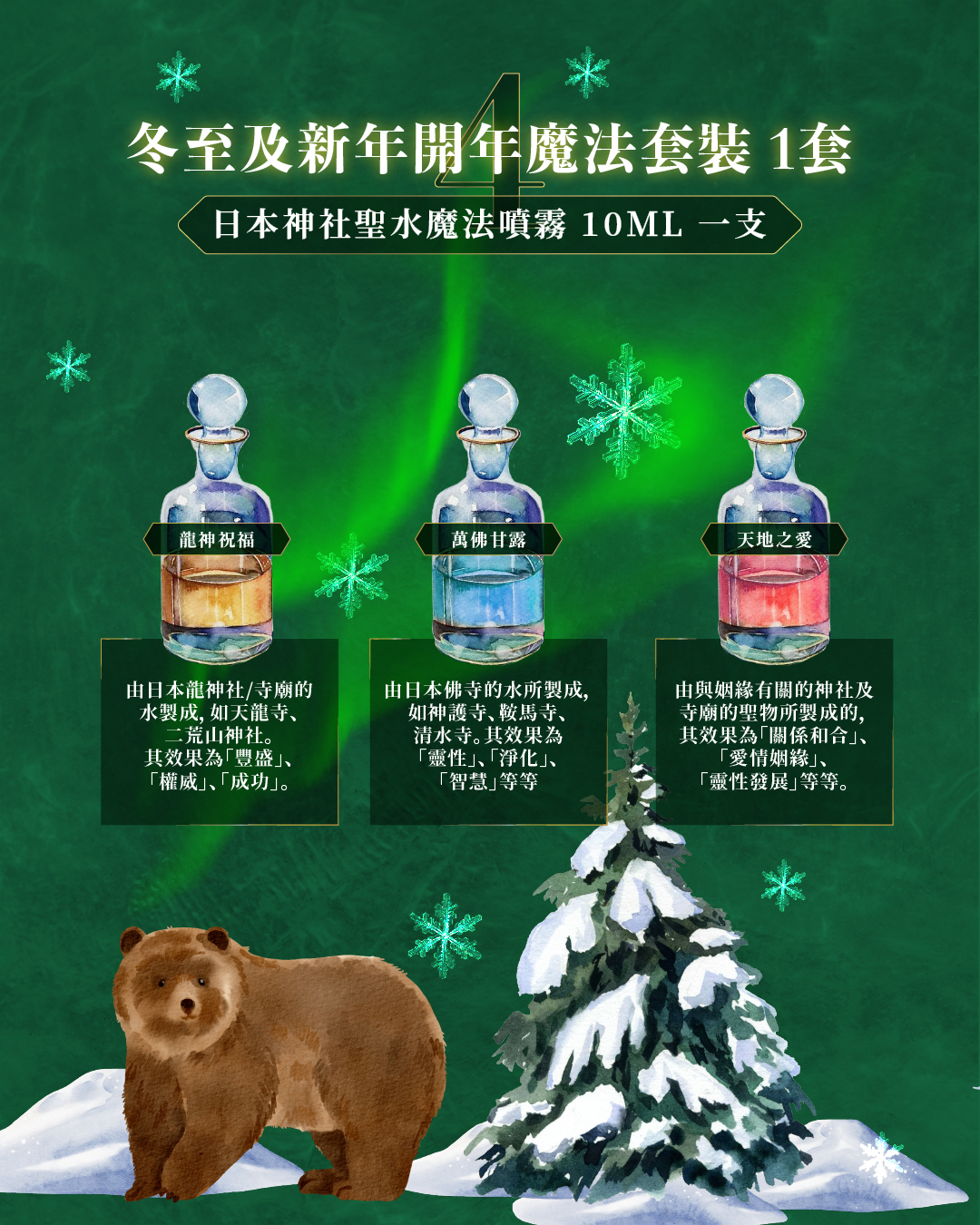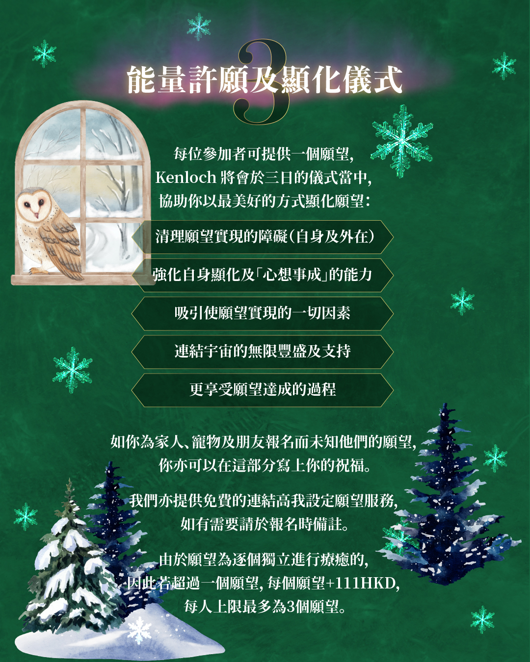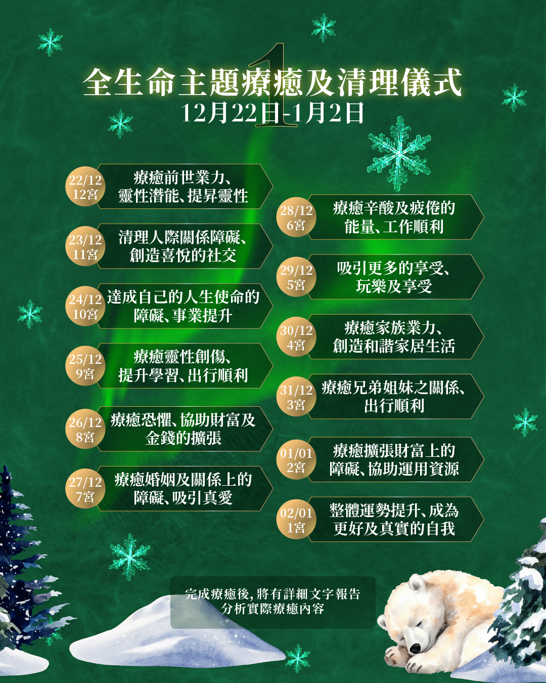 ⛩️☀️冬至及2026新年集體療癒儀式☀️⛩️ 「啟動新一年的無限潛能。」 “Unleashed the infinite potential of new year.” 日期及時間: 2025年12月22日至2026年1月2日 每晚11:00PM-12:00PM 截止報名時間為:2025年12月22日 10:00PM *此為遙距服務,參加者無需到場及實時參與, 完成後將會將約8000字告發給參加者, 大家可繼續冬至團圓及新年倒數🌟 每名參加者可獲✨: 1. ⛩️連續12晚,每晚1小時的全生命主題療癒服務(22/12-2/1) 2. ⛩️冬至及天赦日療癒儀式 3. ⛩️個人願望許願及顯化儀式 4. ⛩️冬至及新年日本聖地能量魔法套裝 1套,每套包括: 日本神社聖水魔法噴霧10ML 一支 —— 龍神祝福 或|萬佛甘露|天地之愛 鍍18K金七大天使流年魔法護符 一個 5. ⛩️388HKD課程及服務現金券 1張 ☀️關於冬至及新年日本聖地集體療癒 ☀️ 冬至(22/12)是全年度日照最短的時候,太陽的力量在此時變得更溫和沈穩,人類可藉此更親近太陽,吸收太陽的能量。因此巫師們會在冬至舉辦儀式,與太陽神的力量連結,並且與眾神攜手,將光明與祝福傳送到所有人身上。 冬至集體儀式將為每一參加者連續十二晚進行橫跨生命十二主題的療癒🐉為大家創造美好的正面改變🌟並清理過去的陳舊能量,為大家「破舊立新」,使大家帶著一個全新而充滿力量的自我,走進2025年。 今年的冬至亦正直「天赦日」,在古中國、日本的傳統中,天赦日的意義是「上天赦免災厄的日子」。Kenloch 會在這天清潔過去的負能量,然後帶著一個能量最乾淨的狀態,進行「補財庫」、「招桃花」、「升運」等儀式,令所有療癒事半功倍。 最後,Kenloch 將會閱讀每一位參加者的占星流年盤,並結合高我/指導靈的指引,於挑選最適合大家的🪽流年天使魔法護符🌈。並利用聖地聖水製作🌟開年聖水魔法噴霧🌟,使大家未來一年持續沐浴於宇宙的光明祝福中。 只要你願意,你隨時都能帶著光與愛,進入全新的開始。 🌕 療癒儀式包括以下內容: 1. 🌞全生命主題療癒及清理儀式🌞 12月22日(十二宮):療癒前世業力、靈性潛能、提昇靈性 12月23日(十一宮):清理人際關係障礙、創造喜悅的社交 12月24日(第十宮):達成自己的人生使命的障礙、事業提升 12月25日(第九宮):療癒靈性創傷、提升學習、出行順利 12月26日(第八宮):療癒恐懼、協助財富及金錢的擴張 12月27日(第七宮):療癒婚姻及關係上的障礙、吸引真愛 12月28日(第六宮):療癒辛酸及疲倦的能量、工作順利 12月29日(第五宮):吸引更多的享受、玩樂及享受 12月30日(第四宮):療癒家族業力、創造和諧家居生活 12月31日(第三宮):療癒兄弟姐妹之關係、出行順利 1月1日(第二宮):療癒擴張財富上的障礙、協助運用資源 1月2日(第一宮):整體運勢提升、成為更好及真實的自我 2. 🌈能量許願及顯化🌈 每位參加者可提供一個願望,Kenloch將會於十二日的儀式當中,協助你以最美好的方式顯化願望: 🍀清理願望實現的障礙(自身及外在) 🍀連結宇宙的無限豐盛及支持 🍀更享受願望達成的過程 🍀提升顯化能力及「心想事成」能力 *如你為家人、寵物及朋友報名而未知他們的願望, 你亦可以在這部分寫上你的祝福。 *由於願望為逐個獨立進行療癒的,因此若超過一個願望, 每個願望+111HKD,每人上限最多為3個願望🙏 3. ☀️額外贈送特別療癒儀式:天赦日療癒儀式☀️ 🌟補充靈魂的豐盛及財富能量(即「補財庫」) 🌟清除障礙運勢順利流動的能量及業力(即「改運」) 🌟為個人運勢加入更多光明能量(即「昇運」) 🌟清除不必要的靈魂契約(即「斬爛桃花」) 🌟帶來寬恕、釋放的能量,清除重複的愛情、金錢、情緒模式(即「消業力」) 🪽天赦日的能量一般會持續2-3日,Kenloch也會在12月22-24日期間持續進行以上的儀式,以強化儀式效果🦌🌕 4. ☀️冬至及新年開年魔法套裝 1套☀️ 🌟鍍18K金天使流年魔法護符 一個 🌟 🪽大天使麥凱爾 Michael: 為新一年帶來新的財富來源、成為更好的自己 🪽大天使加百列 Gabriel: 在新年建立豐盛、安穩、舒適的內心及生活、提升靈性 🪽大天使拉斐爾 Raphael: 在新一年建立更多充滿愛的人際關係、提升創意及顯化力 🪽大天使薩弗爾 Thavael 建立生活幸福美滿的新一年、吸引真愛 🪽大天使薩穆爾 Samuel: 在新一年帶來好運、成功及勝利,並建立強力的保護 🪽大天使烏列爾 Uriel : 在新一年帶來萬事萬物的幸福擴張與成功、並提升靈性及智慧 🪽大天使薩基爾 Zadkiel: 消除負面業力、帶來強力的保護及轉化、紮根及接地 🪽七大天使護符 Seven Archangelic Sigil 為新一年帶來七大天使、七大行星及七重天的神聖祝福 👼Kenloch將閱讀每一位參加者的流年命盤,並按照每一位參加者的流年命盤挑選; 👼每個額外護符價格為222HKD; 👼可額外+999HKD,以獲得全八個護符,如購買全八個護符,Kenloch也會提供建議,讓你知道應於2025年每個月應配戴的天使護符。 ⛩️日本神社聖水魔法噴霧 10ML 一支⛩️ 🐉龍神祝福🐉 由日本龍神社/寺廟的水製成,如天龍寺、二荒山神社。其效果為「豐盛」、「權威」、「成功」。 ☁️萬佛甘露☁️ 由日本佛寺的水所製成,如神護寺、鞍馬寺、清水寺。其效果為「靈性」、「淨化」、「智慧」等等 ☀️天地之愛🌕 由與姻緣有關的神社及寺廟的聖物所製成的,其效果為「關係和合」、「愛情姻緣」、「靈性發展」等等。 報名請IG DM或Whatsapp +852 56880388